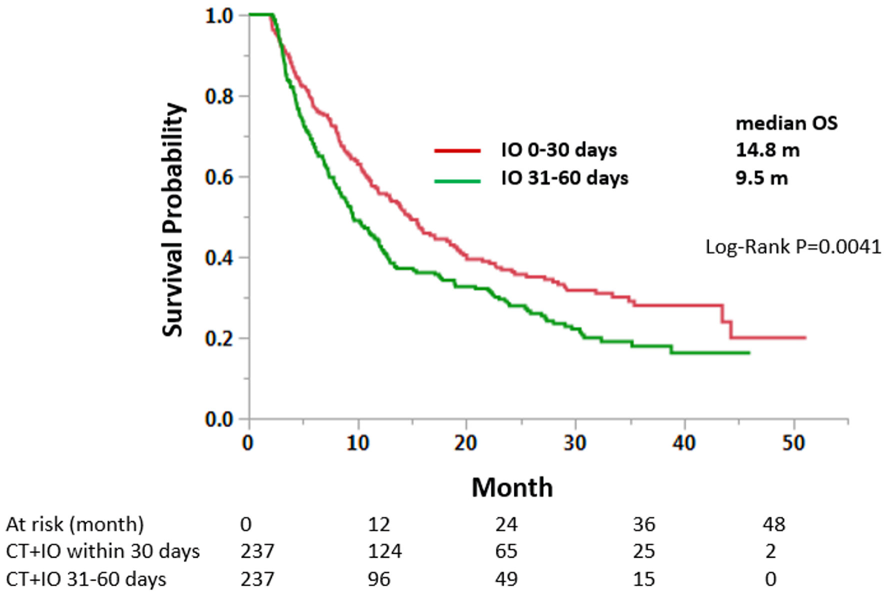 ![]() Click for large image | Figure 3. Propensity score matching analysis of early (30 days) and delayed (31 - 60 days) immunotherapy groups. Matched cases were compared for OS. CT: chemotherapy; IO: immunotherapy; OS: overall survival. |