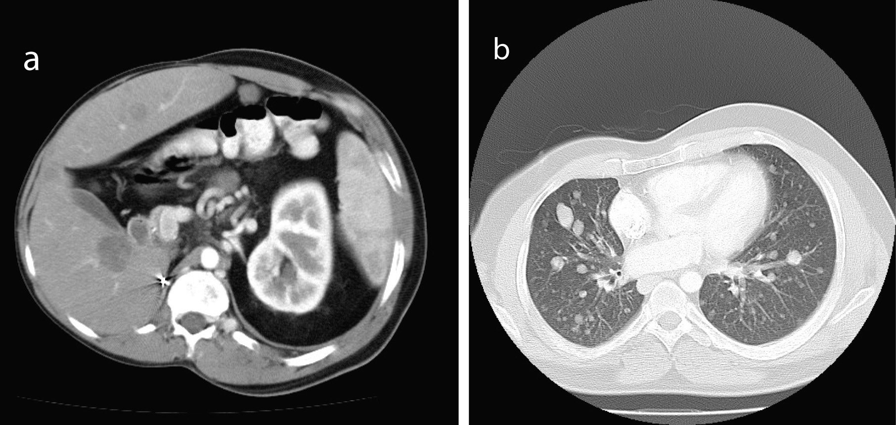 ![]() Click for large image | Figure 1. Staging CT showed multiple metastases (a, b). |