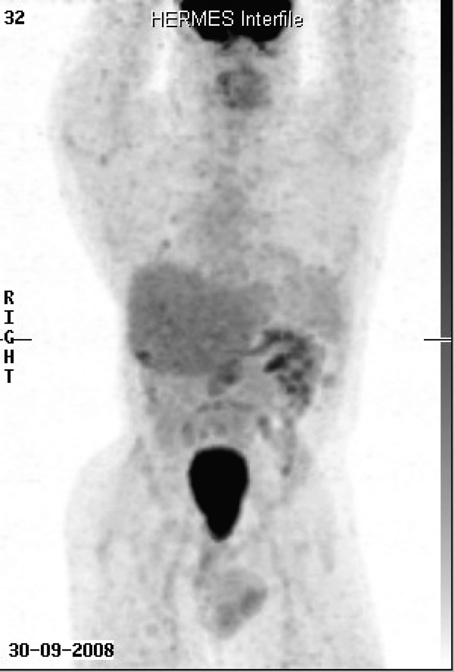When first seen at the Cancer clinic, he appeared to be a pleasant, average built man with extensive scoliosis of his spine. He had an enlarged liver and axillary and submental lymphadenopathy. He underwent an excision biopsy of the axillary node. Histopathology was consistent with leiomyosarcoma, with well encapsulated, moderately pleomorphic and mitotically active smooth-muscle tumor. Desmin stain was positive and smooth muscle actin stain showed patchy positivity; AE1/AE3, S100 and C-Kit and EBER were all negative. Staging CT scans were performed which showed multiple metastases (Fig. 1). A staging positron emission tomography-CT scan showed uptake in the para-aortic region, the liver, a nodule inferior to the spleen, a nodule anterior to the proximal right latissimus dorsi muscle and variable uptake in the pulmonary nodules (Fig 2). The investigations confirmed a diagnosis of RIS of LMS subtype, with dominant mass in the previous radiotherapy site and extensive metastases almost three decades after his initial treatment. He was offered palliative chemotherapy, but he declined and went onto having various alternative therapies and finally succumbed to his cancer nearly 12 months after the diagnosis.