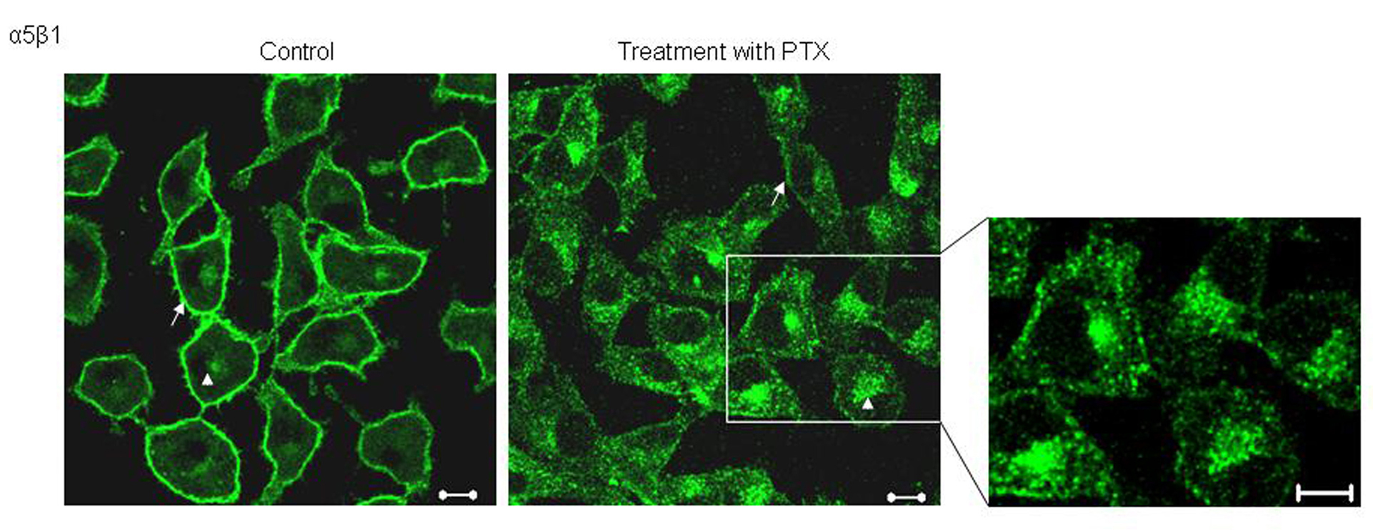 ![]() Click for large image | Figure 1. Effect of PTX on the localization of α5 integrins. Untreated and PTX treated cells, fixed and probed with an antibody against α5 integrins and visualized by FITC conjugated secondary antibody. Representative images are shown here. Scale bar, 10 µm. |