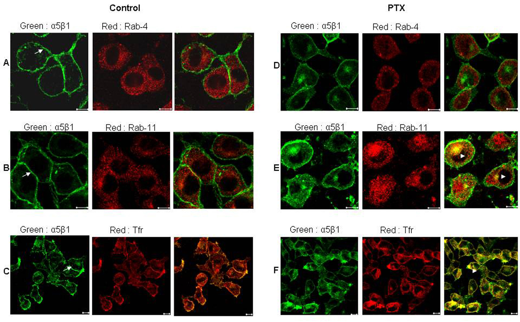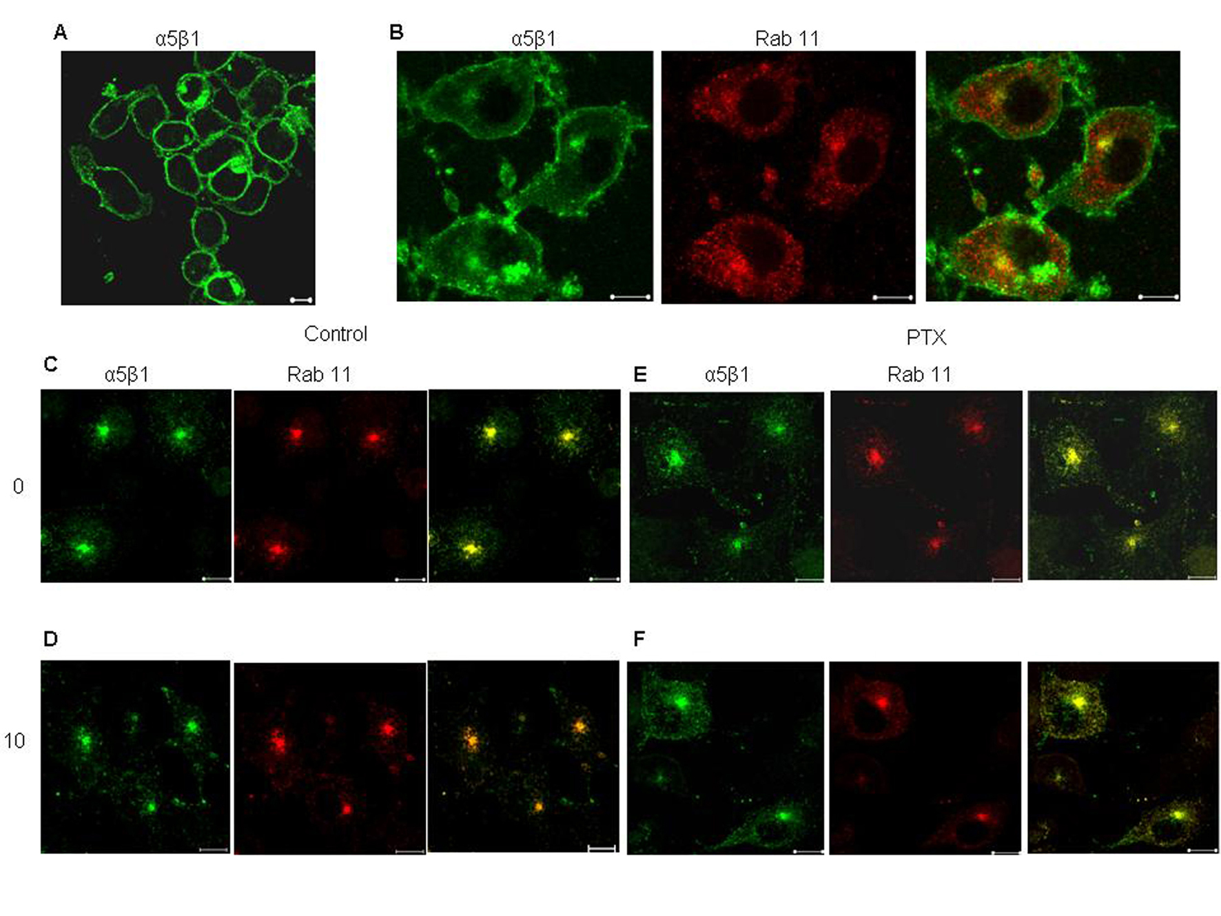 Post PTX treatment, α5 integrins colocalizes with Rab-11 and transferrin receptor - markers of recycling endosomes