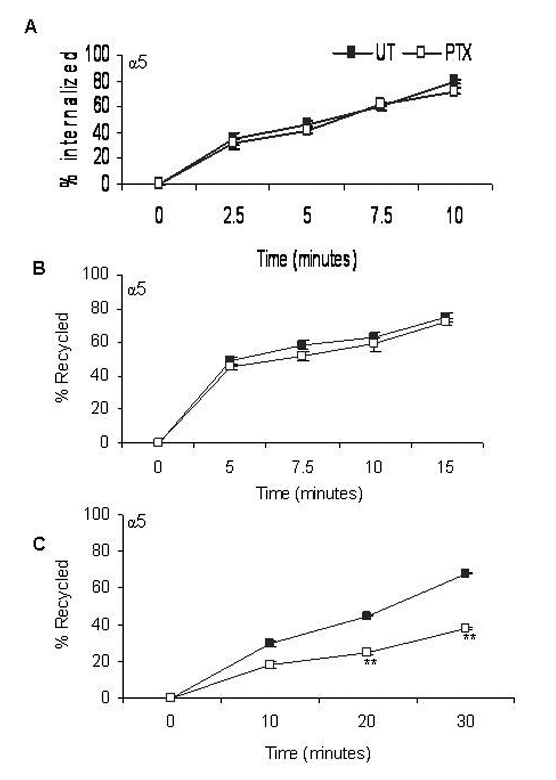 Integrin internalization was studied by surface labeling F10 cells with membrane impermeable Biotin for various time points in the presence of the recycling inhibitor, Primaquine. In untreated cells, approximately 40% of the cell surface α5 integrins were internalized in 5 minutes and by the end of 10 minutes, a steady state was reached (Fig. 3A), whereas PTX treated cells showed no change in the rates of internalization of α5 integrins.