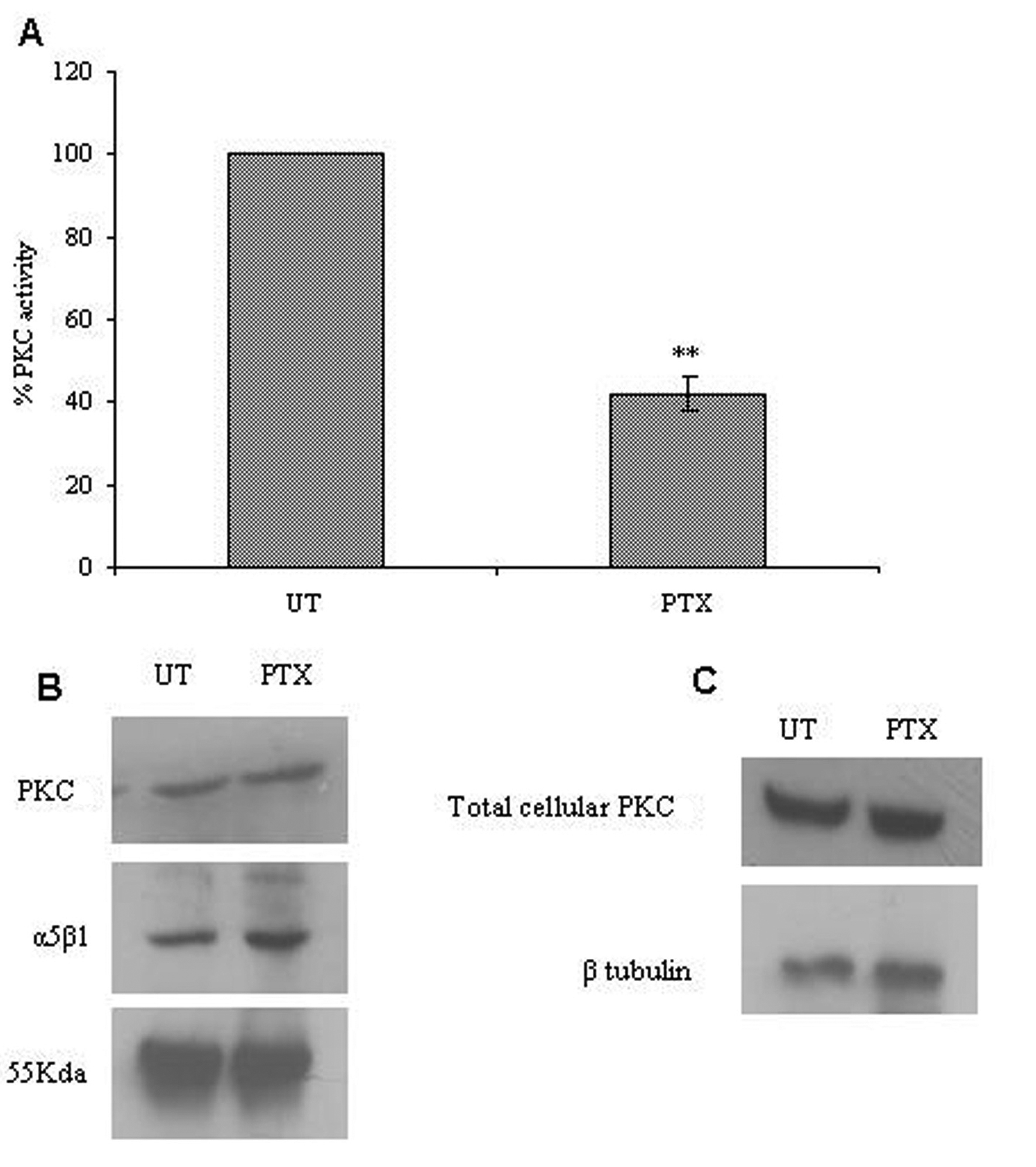 We studied the effects of PTX on PKC activity associated with α5β1 integrins. Post PTX treatment there was a 50% reduction in the PKC activity associated with α5β1 integrins (P < 0.001, students t-test) but there was no change in associated PKC levels (Fig. 5A, B). Total cellular lysates showed no changes in the protein levels of PKC and α5β1 integrins on PTX treatment.