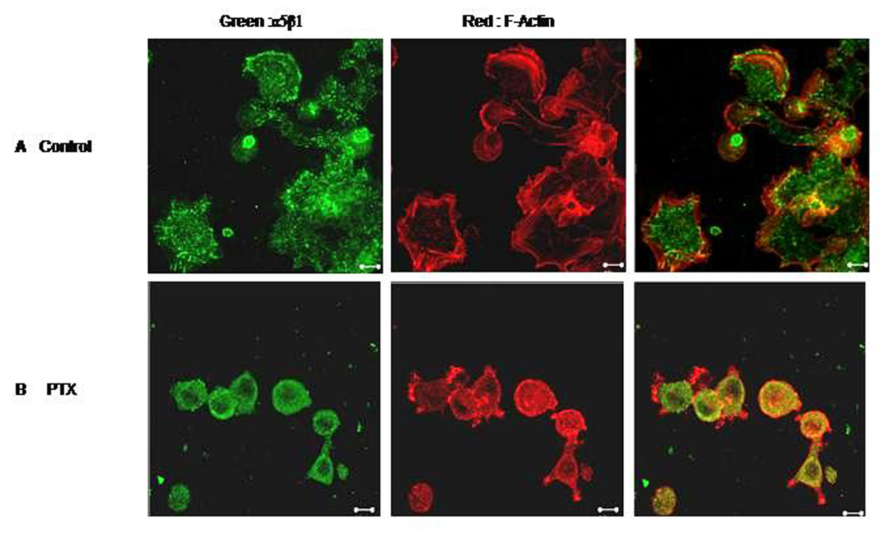 We next checked the effect of PTX on cell spreading. Untreated B16F10 cells spread well on Fibronectin /Fibrinogen coated plates within 30 minutes. Cells showed development of numerous lamellopodial extensions (Fig 6). F-Actin staining was strong on the membranes where actin formed thick bundles along the lamellopodial margins. PTX treated cells, on the other hand, could not spread as effectively. The α5β1 integrins also accumulated in perinuclear endosomes-like vesicles with diminished membrane staining.