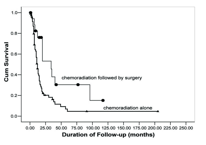 ![]() Click for large image | Figure 1. Overall survival as a function of treatment group. Comparison of OS rates in neoadjuvant chemoradiation followed by surgical resection (circles) versus concurrent chemoradiation alone (triangles). |
