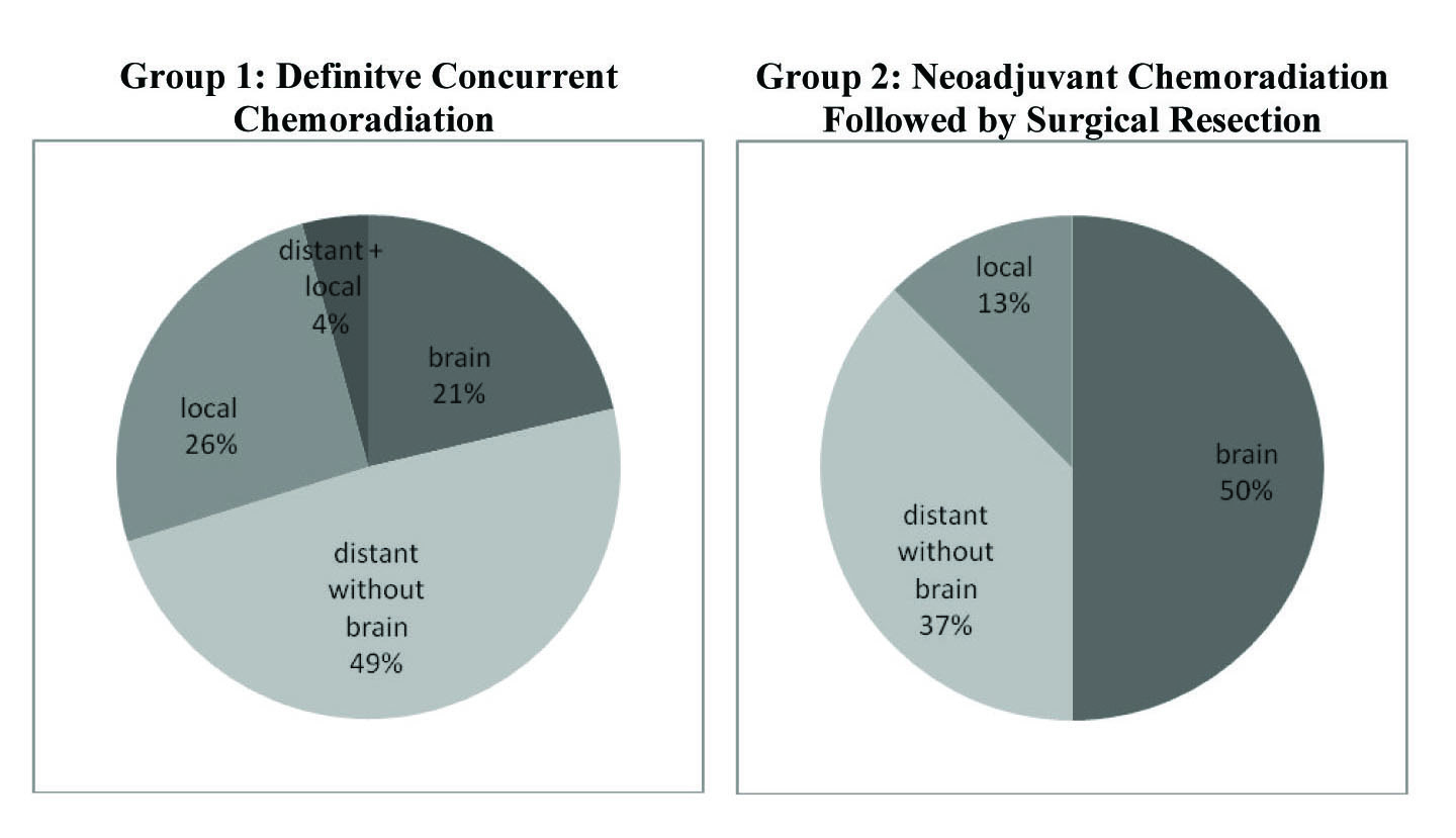 Evaluation of failure patterns will help to justify the application of one treatment plan over another as well as indicate which options are resulting in failure. In order to answer that question this study examined failure patterns associated with stage IIIA and IIIB NSCLC. Specifically, a comparison was made between failure rates of definitive chemoradiation versus neoadjuvant concurrent chemoradiation followed by surgical resection. We hypothesized that given the poor local control rates with chemotherapy and radiation therapy alone, surgery would improve the outcomes but OS may not be improved given the mortality risk from surgery. These factors together could help to increase the currently dismal survival rate of this common cancer.