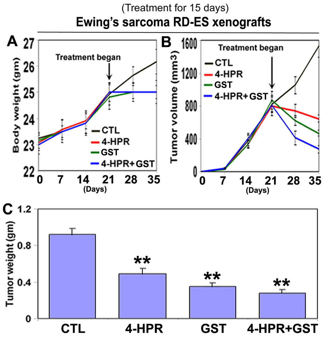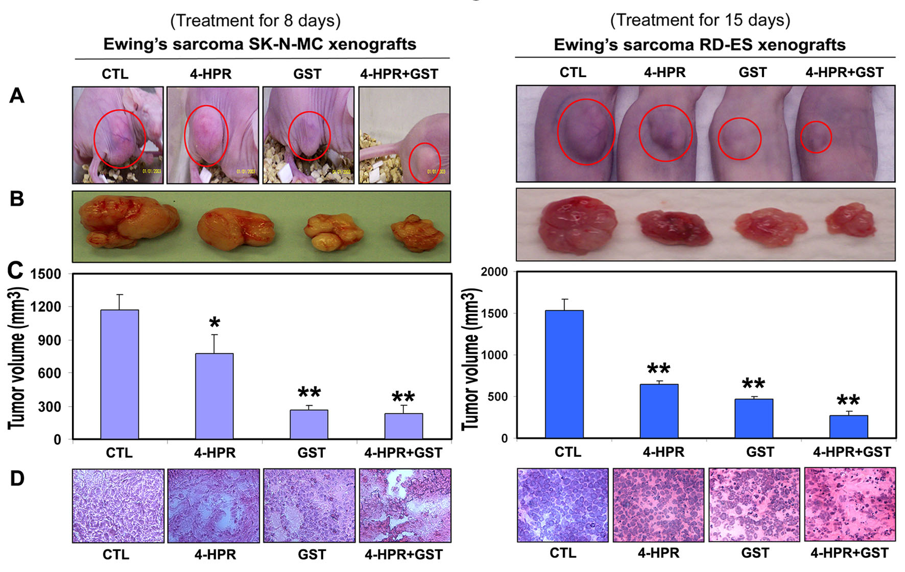 Conclusions: Results revealed that combination of 4-HPR and GST could be highly effective treatment for inhibiting Ewing’s sarcomas in vivo.