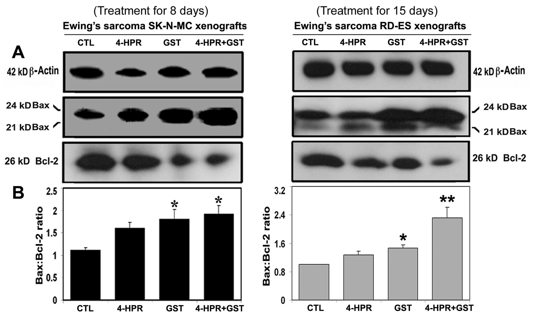 Western blotting showed alterations in the expression of Bax and Bcl-2 proteins in Ewing’s sarcoma SK-N-MC and RD-ES xenografts (Fig. 3). Expression of 42 kD β-actin was used as a loading control (Fig. 3A). Treatment with 4-HPR plus GST increased the Bax : Bcl-2 ratio in both xenografts (Fig. 3B). Increase in Bax : Bcl-2 ratio could cause mitochondrial release of pro-apoptotic molecules to trigger activation of downstream processes of apoptosis.