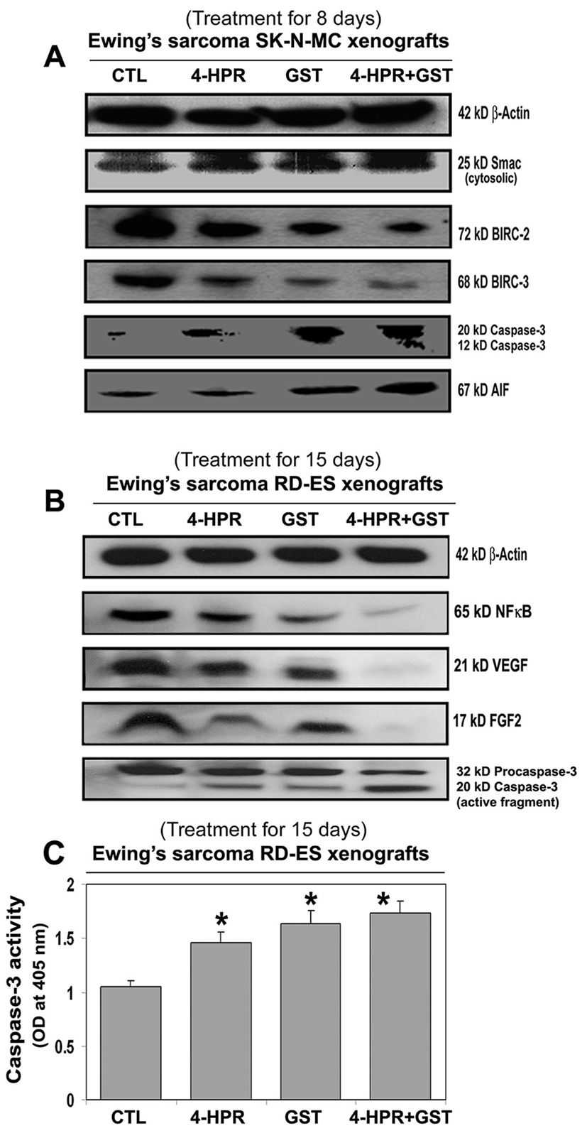 Results: Histopathological examination of tumor sections showed that control group maintained characteristic growth of tumors, 4-HPR alone inhibited proliferation of tumor cells, GST alone induced apoptosis to some extent, and combination of 4-HPR and GST significantly induced apoptosis in both Ewing’s sarcoma xenografts. Time-dependent reductions in body weight, tumor volume, and tumor weight were also found. Combination therapy increased Bax : Bcl-2 ratio to trigger mitochondrial release of Smac/Diablo into the cytosol to downregulate the baculovirus inhibitor-of-apoptosis repeat containing (BIRC) proteins such as BIRC-2 and BIRC-3 and thereby promote apoptosis. Activation of caspase-3 and mitochondrial release of apoptosis-inducing factor (AIF) occurred in course of apoptosis. Downregulation of the survival factor NF-κB and the angiogenic factors VEGF and FGF2 and increase in caspase-3 activity controlled tumor growth. In situ immunofluorescent labelings showed overexpression of calpain, caspase-12 and caspase-3, and AIF in xenografts, indicating induction of cysteine proteases and AIF for apoptosis.