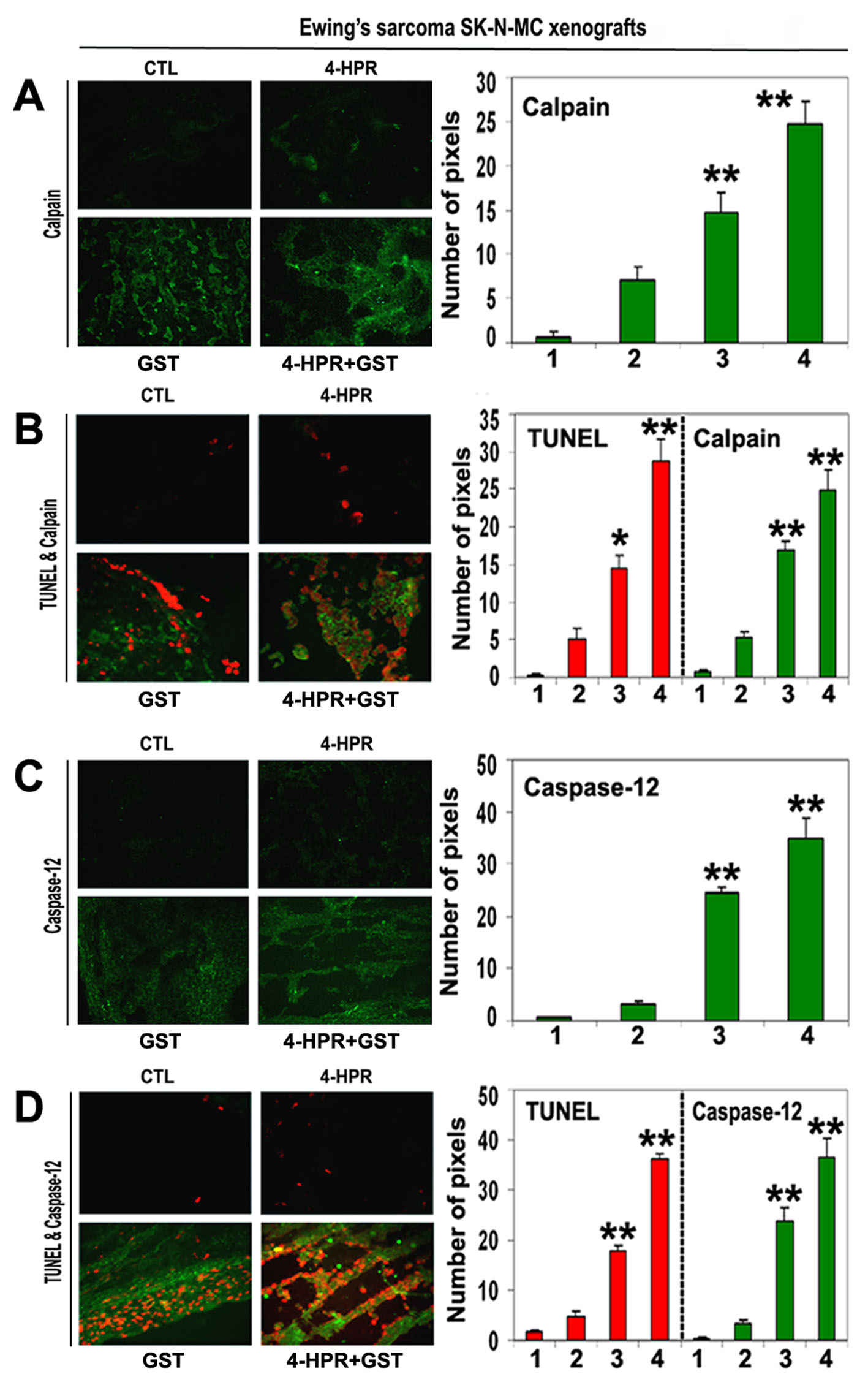 We employed single immunofluorescent (SIF) staining to detect expression of specific pro-apoptotic protein (Fig. 5) whereas double immunofluorescent (DIF) staining to detect expression of specific pro-apoptotic protein and DNA fragmentation in apoptotic cells in the xenograft sections (Fig. 5). SIF staining showed a significant increase in calpain (Fig. 5A) and DIF staining detected significant overexpression of calpain and increase in DNA fragmentation in Ewing’s sarcoma RD-ES xenografts following treatment with 4-HPR plus GST (Fig. 5B), indicating calpain upregulation for apoptosis in Ewing’s sarcoma SK-N-MC xenografts.