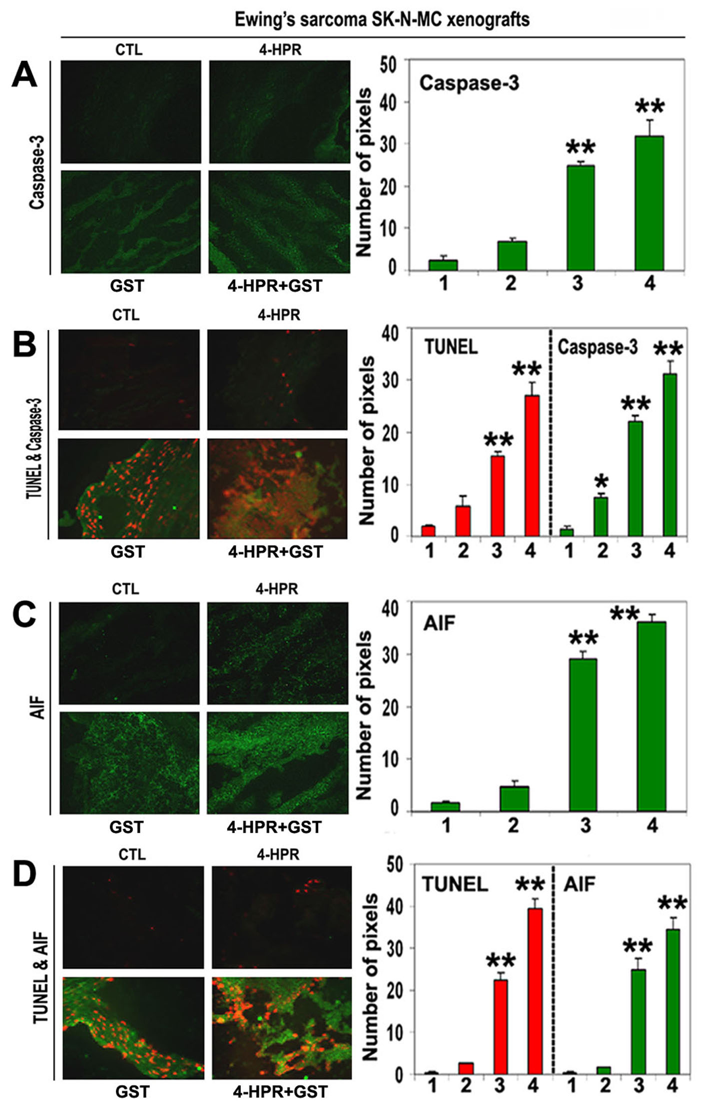To identify caspase-independent mechanism in apoptosis, we examined the expression of AIF using SIF staining and found significant increase in expression of AIF in the SK-N-MC xenografts after treatment with 4-HPR plus GST (Fig. 6C). Overexpression of AIF and increase in DNA fragmentation occurred most significantly in the Ewing’s sarcoma xenografts after combination therapy (Fig. 6D). These observations showed the highest induction of caspase-dependent pathway as well as caspase-independent pathway for apoptosis in Ewing’s sarcoma SK-N-MC xenografts after treatment with 4-HPR plus GST.