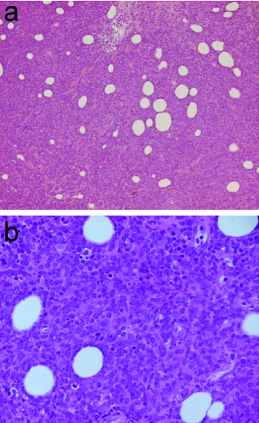 ![]() Click for large image | Figure 1. Hematoxylin and Eosin stain, (a) 10 X and (b) 40 X magnification, demonstrating atypical mononuclear large cell infiltrate with poorly defined cytoplasmic borders, large prominent nucleoli and frequent mitosis. |