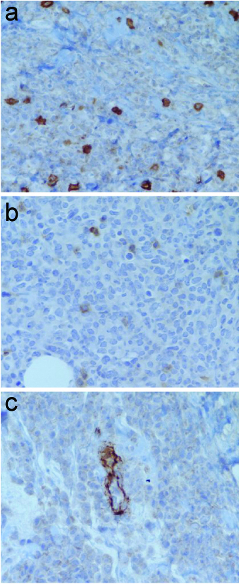 ![]() Click for large image | Figure 2. Immunoperoxidase staining negative for (a) CD 3, (b) CD 5, and (c) CD 34. |