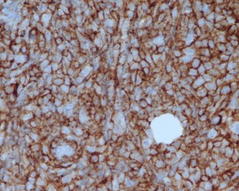 ![]() Click for large image | Figure 3. Positive immunoperoxidase staining for CD 20 (60 X magnification). |