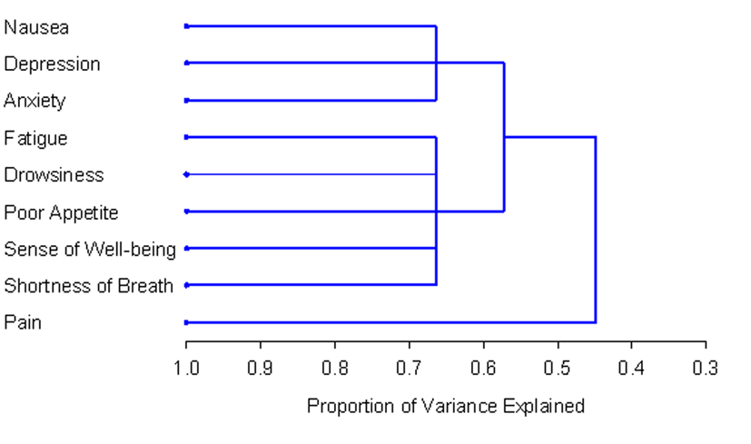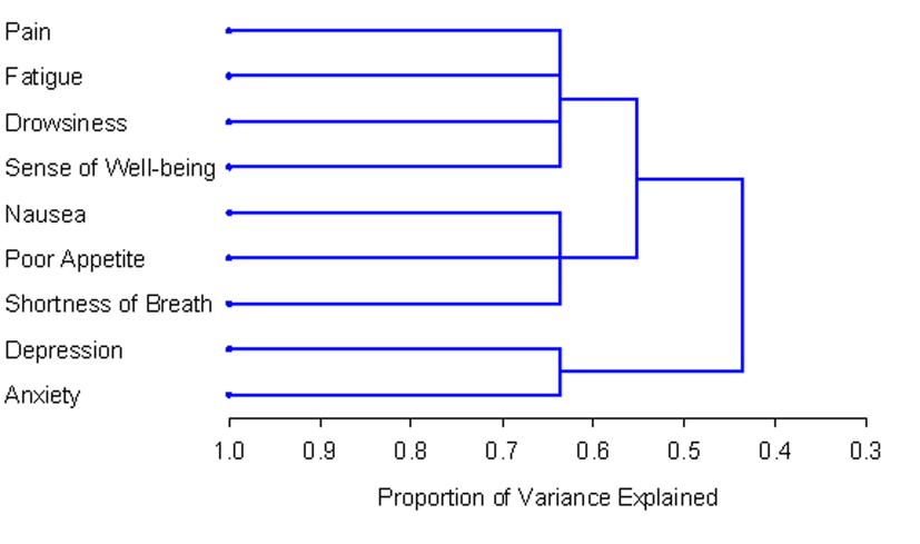 HCA identified clusters using average linkage between groups. This method is centered on classification, grouping similar entities together and separating this cluster from other clusters [12]. HCA is also commonly utilized to categorize groups of individuals with similar symptom profiles. Clusters were formed according to the distance between symptoms severities, determined using Euclidian distances. The PROC VARCLUS runs clusters on the basis of centroid components. The R2 values of each symptom with its own cluster and with its nearest cluster were calculated. The 1-R2 ratio is the ratio of one minus the value in the “Own Cluster” column to one minus the value in the “Next Closest” column. The lower the ratio, the more separated the clusters are. HCA produces a visual diagram, or dendrogram, of clusters identified. Symptoms that converge earlier on the dendrogram are more closely related than those that converge later.