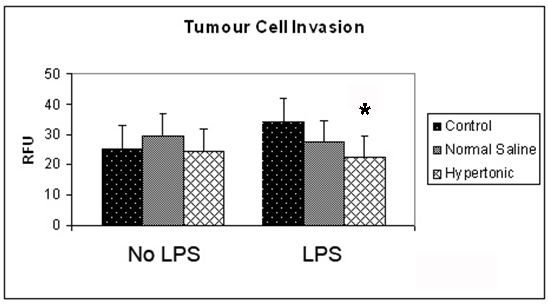 It was observed that exposure to a hypertonic environment did not significantly affect the invasive capacity of unstimulated 4T1 tumor cells (Fig. 1). However, exposure of 4T1 cells to 100 ng/mL LPS increased the ability of 4T1 cells to invade through an extra cellular matrix layer. This affect was attenuated by a hypertonic environment which reduced invasion post stimulation from 34.5 to 22.1 RFU (P = 0.01).