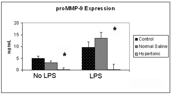 The effect of MMPs on the ability of tumor cells to invade is clear [5-9], however the relative importance of tumor cell or host expressed MMPs, remains quite controversial. In this series of experiments cells cultured in a hypertonic environment exhibited just 1% of the proMMP-9 expression seen in control cells. The stimulation of tumor cells with LPS resulted in a profound increase in proMMP-9 expression, an effect completely negated by a hypertonic environment. Thus, a hypertonic environment can successfully attenuate the effects of LPS on proMMP-9 expression in vitro.