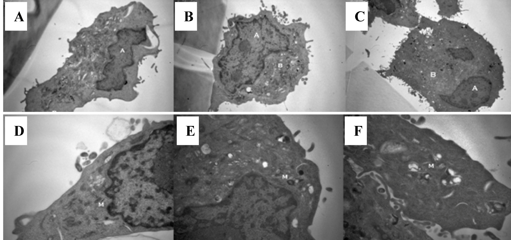 Tumor cell morphology was visualised through use of transmission electron microscopy. Cells were imaged following 1 hour exposure to a hypertonic environment. Two groups exposed to culture medium and normal saline were used as controls. The cells in a hypertonic environment exhibited a reduction in nuclear/cytoplasmic ratio (P = 0.005) (Fig. 3A-C). Cells exposed to a hypertonic environment possessed well defined plasma membranes and contained intact organelles with no evidence of nuclear condensation or apoptotic bodies. No differences in vacuoles, lysosomes or secretions were noted between the groups. Mitochondria from those cells cultured in a hypertonic environment were less electron dense suggesting an increased physiological strain on the cell (Fig. 3D-F).