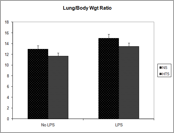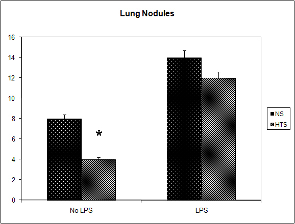 In a second experiment to determine the effect of LPS in the presence of systemic hypertonicity, 20 mice received an intraperitoneal (i.p.) injection of 10 µg lipopolysaccharide (serotype 055:B5; Sigma Chemical, St. Louis, MO) 7 days after tumor injection. Two minutes later systemic hypertonicity was induced with a bolus of 2 mL/kg normal saline (0.9% sodium chloride; NS) (n = 10) or 2 mL/kg hypertonic saline (7.5% sodium chloride; HTS) (n = 10). All animals were warmed until recovered from sedation. After 14 days, all mice were sedated, weighed and euthanized by cervical dislocation. Lungs were harvested and lung weight and incidence of surface pleural lesions recorded. The number and size of experimental metastases were determined by an independent observer and the number of clonogenic lung metastases was determined.