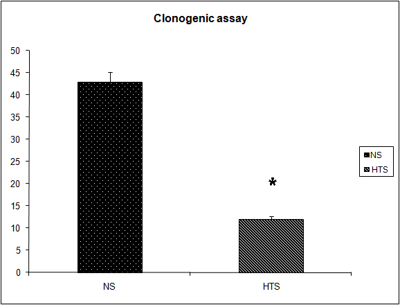 ![]() Click for large image | Figure 6. Effect of hypertonicity on clonogenic assay. Animals were injected with 5 x 104 4T1 tumor cells. Two minutes later mice received an intravenous bolus of 2 mL/kg normal saline (0.9% sodium chloride; NS) or 2 mL/kg hypertonic saline (7.5% sodium chloride; HTS) via lateral tail vein. Animals were sacrificed after 14 days and clonogenic assay performed. Data are expressed as mean and are representative of n = 20 animals. *P < 0.05 versus NS control. |