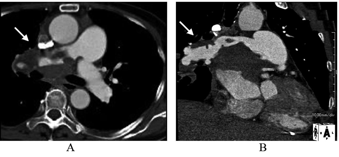 ![]() Click for large image | Figure 1. The image of Contrast-enhanced computed tomography scan. Early arterial phase showed massive filling defects in the proximal portion of right pulmonary artery and around the left atrium in axial (A) and sagittal (B) views. |