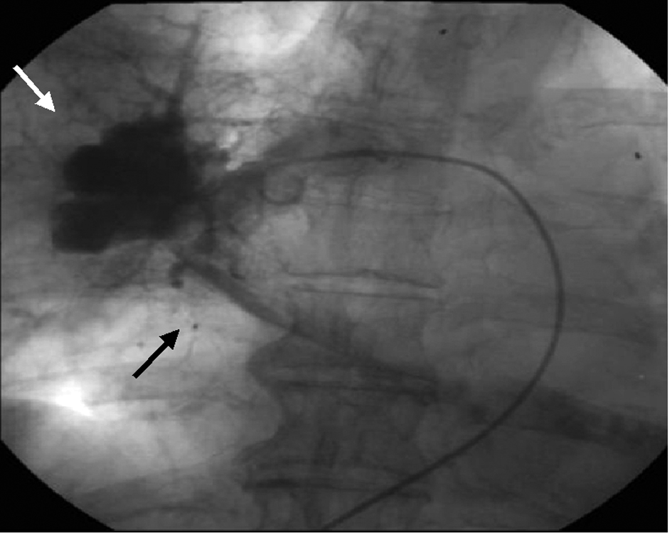 ![]() Click for large image | Figure 2. The image of right pulmonary angiography. Vascularized mass (white arrow) with a fistula from the right pulmonary artery to the left atrium (black arrow). |
