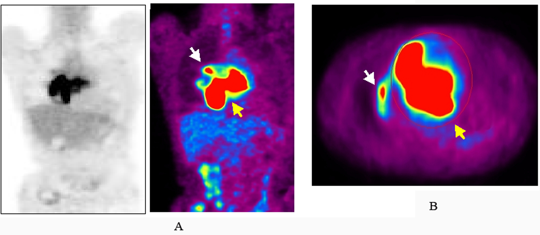 ![]() Click for large image | Figure 3. The image of maximum intensity projection image of 18-fluorodeoxyglucose positron emission tomography (FDG-PET). Increased uptake of FDG at the area of the right pulmonary artery (white arrow) and the bilateral atria (yellow arrow) in coronal (A) and axial (B) views. |