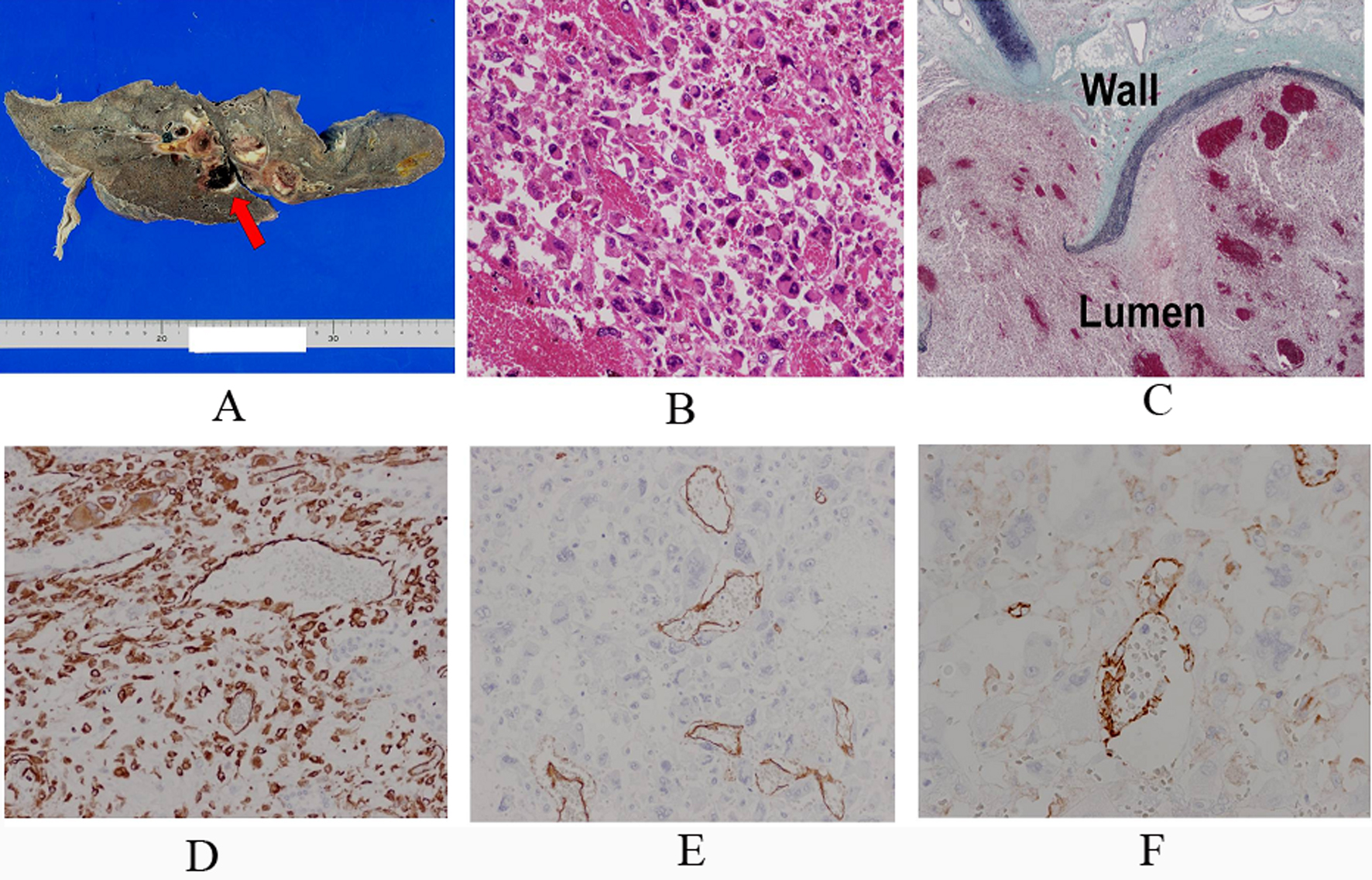 ![]() Click for large image | Figure 4. A. Macroscopical finding showed that the right main trunk and its second branched segments of the pulmonary artery were completely occluded by the tumor and thrombus. A red arrow indicates the right pulmonary artery. B. Hematoxilin and eosin staining showed that the tumor cells were composed of pleomorphic cells which had large and vesicular nuclei with prominent nucleori and abundant eosinophilic cytoplasm. C. Elastica and masson staining showed the destruction of the wall of the right pulmonary artery by the tumor cells. ‘Wall’ indicates the wall of the right main trunk of the pulmonary artery, and ‘Lumen’ indicates its lumen. D. D, E and F: Immunohistochemical findings showed the tumor cells were diffusely positive for vimentin (D), focally positive for CD31 (E) and CD34 (F) in the vascular channel area. |