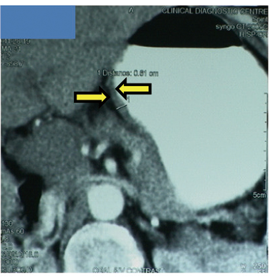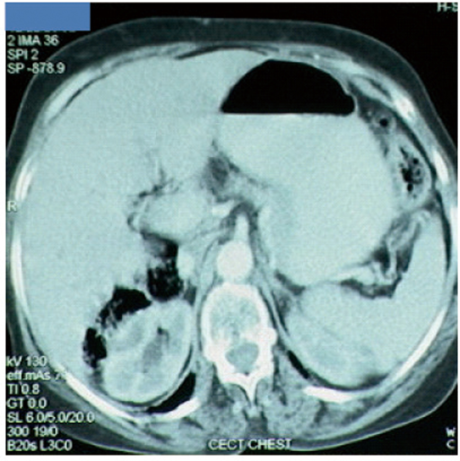 A 65-year-old postmenopausal woman presented in May 2007 with vomiting, early satiety and 20 lbs weight loss over last 2 months. There was no history of associated fever, cough, bleeding from any site, and the family history was also insignificant. On examination, pallor was present. However, no icterus, edema or lymphadenopathy was noted. Detailed systemic examination revealed no abnormality. Investigations revealed mild anemia (Hb 9.8 g/dL) and elevated alkaline phosphatase levels (310 U/L). Esophagogastroduodenoscopy (EGD) showed large ulcerated lesion at the fundus, extending into the esophagus. CECT abdomen showed mass lesion in gastric cardia extending to involve the gastroesophageal junction and fundus, with compression of fat planes and wall thickness of 44 mm. There were multiple space occupying lesions (SOLs) in the right lobe of liver, the largest measuring 4.3 x 3.1 cm (Fig. 1). Tissue specimens from endoscopic biopsy (gastric region) and CT guided FNAC of liver showed moderately differentiated adenocarcinoma. Hence, a diagnosis of gastric carcinoma with liver metastases was made. Tumor markers - CEA and CA 72.4 levels were 1.7ng/mL and 0.99 U/mL respectively. The patient was then started on chemotherapy regimen consisting of docetaxel, oxaliplatin and capecitabine (DOX). Docetaxel was administered as 25 mg/m2 followed by oxaliplatin 50 mg/m2 on days 1 and 8, with capecitabine 625 mg/m2 BID from days 1 to 14, in 21-day cycles. The protocol was well tolerated by the patient except for grade 2 hematologic toxicity, which responded to blood product transfusions, erythropoietin and G-CSF. Patient also experienced diarrhea, managed with supportive therapy. A thorough workup done was after 3 and 6 cycles of chemotherapy to evaluate the response. Investigations at the end of 6 cycles of chemotherapy (November 2007) showed decreased gastric lesion, with a wall thickness of 8 mm on CT abdomen (Fig. 2); the particular liver lesion also decreased in size to 1.3 x 1.1 cm. EGD revealed few small erosions in fundus near the gastroesophageal junction, no ulcer or growth was seen. CT abdomen done 3 months later (February 2008) showed complete absence of gastric and liver lesions (Fig. 3). This patient responded dramatically to the chemotherapy protocol, as evidenced by > 50% decrease in the size of gastric and liver lesions after 6 cycles of chemotherapy, and complete disappearance of the lesions after further 3 months. Hence the patient’s clinical response to chemotherapy was labeled as CR. The patient continued to maintain CR for about 9 months, since the initial response.