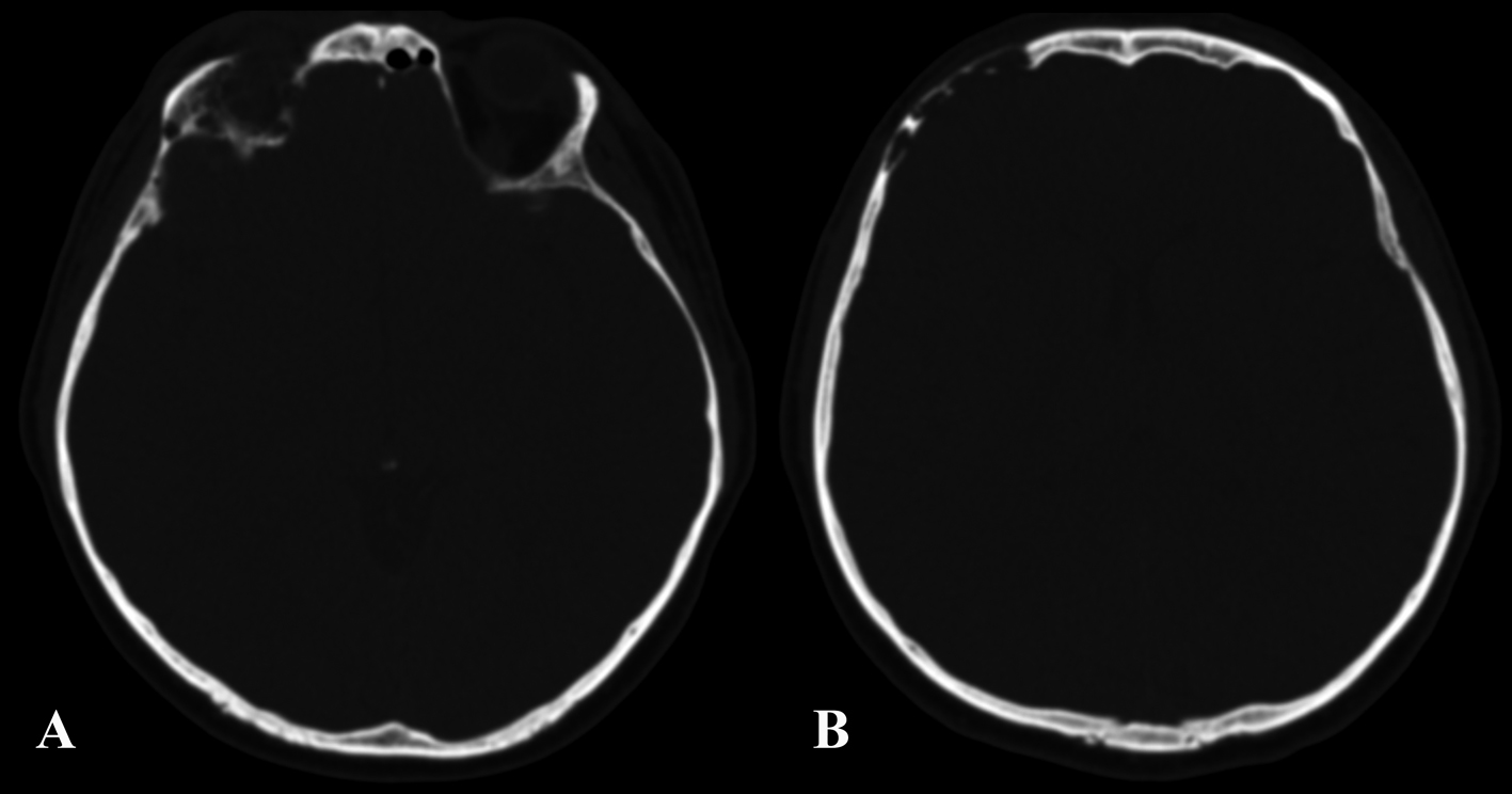 ![]() Click for large image | Figure 1. Pre-operative CT showing the involvement of the right orbital roof (A) and the right frontal bone (B) by the lesion. |