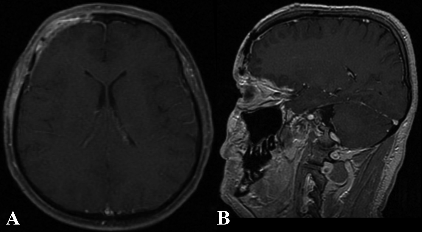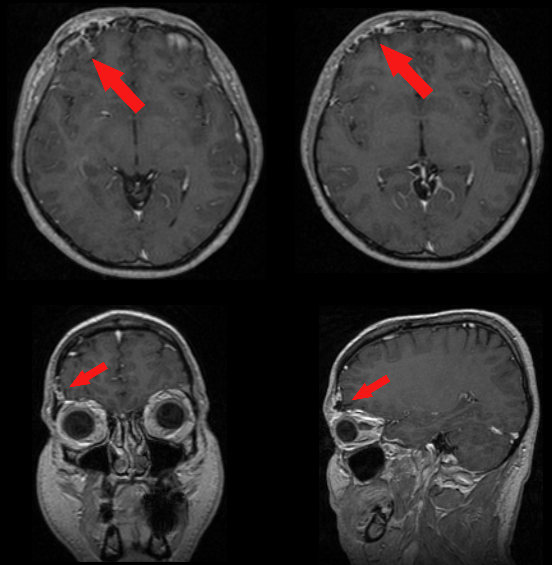 A 37-year-old man was admitted to our hospital complaining of frequent episodes of headache for the past several months. He was followed by the otolaryngologist for sinusitis, but for the persistence of the headache, computed tomography (CT) and magnetic resonance (MR) of the brain were performed. CT scans showed a right frontal calcified lesion e (Fig. 1) and marked enhancement post contrast and MR revealed hypointense lesion in the right frontal lobe with heterogeneous contrast enhancement after Gadolinium administration (Fig. 2). On admission to our department, general, physical and neurological examination found no abnormalities. X-ray scan of the skull revealed an extended geographical area of osteolysis in charge of the frontal squama in the right supraorbital region with involvement of the roof of the ipsilateral orbit and hypoplasia of frontal sinus. A brain CT and MR were repeated and showed no changes beyond those already performed. There were no stigmata or family history of neurofibromatosis.