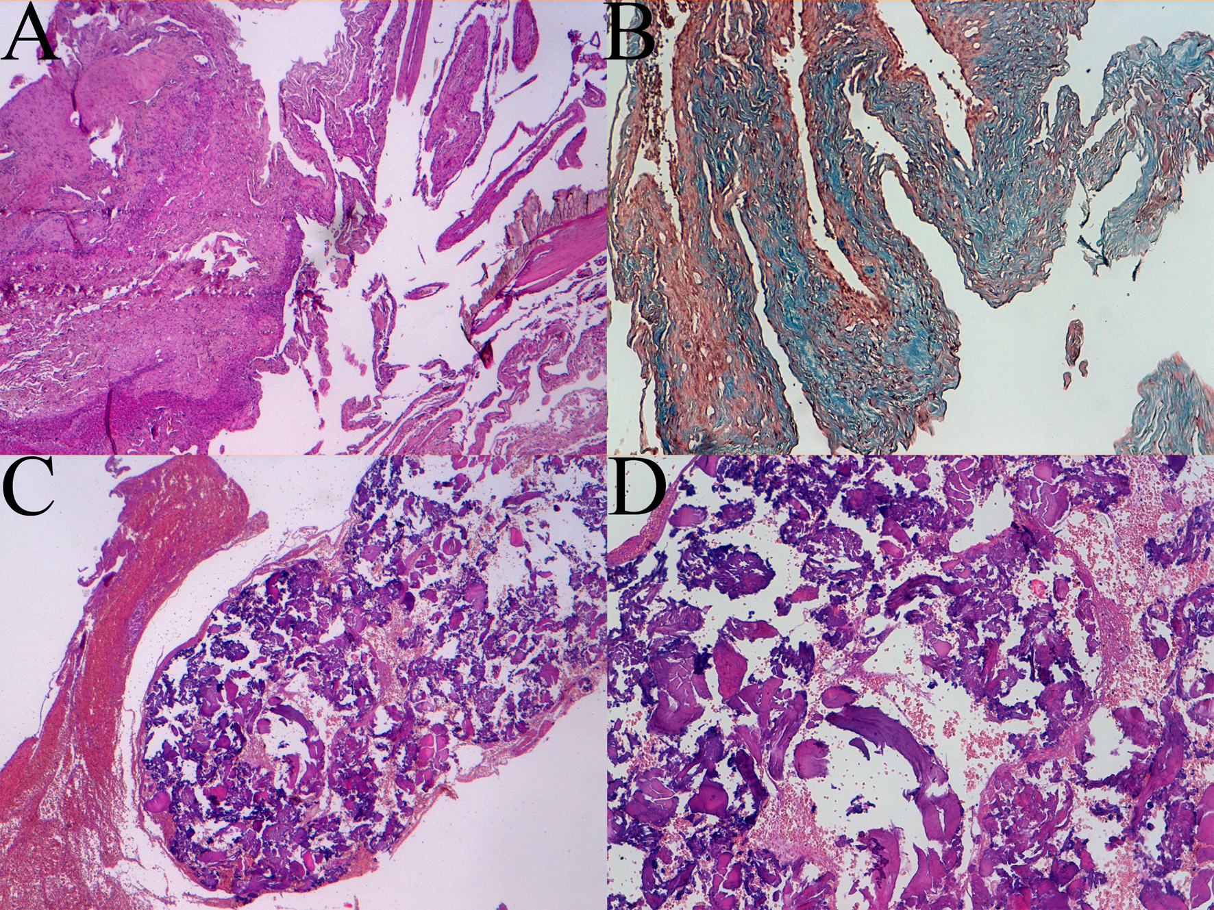 ![]() Click for large image | Figure 3. Histologic patterns of meningioangiomatosis: A sclerotic areas (4 × magnification), B trichrome coloration view (10 × magnification), C and D bone metaplasia at 4 × and 10 × magnification respectively. |