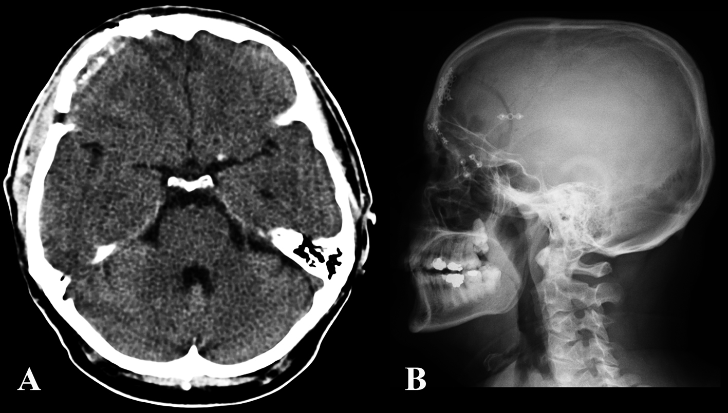 ![]() Click for large image | Figure 4. Post-operative CT (A) and skull x-plain film (B) showing the craniotomy and bony reconstruction. |