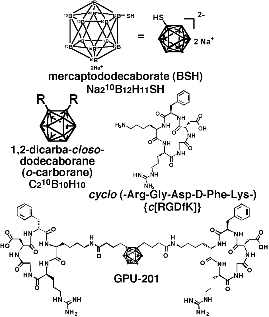 ![]() Click for large image | Figure 1. Chemical structure of disodium mercaptododecaborate-10B (BSH), 1, 2-dicarba-closo-dodecaborane (o-carborane), cyclo(-Arg-Gly-Asp-D-Phe-Lys-) {c(RGDfK)} and GPU-201. |