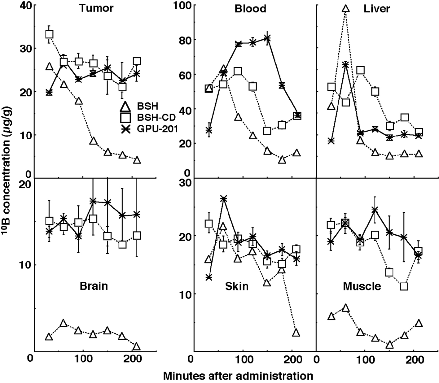 Figure 2 shows the time course of change in the values of the 10B concentration in solid tumors, brain, blood, liver, muscle, and skin. Although the concentrations of 10B were actually low in the brain and the concentrations of 10B in muscle and skin were a little lower than those in the tumors, the concentrations of 10B in blood and liver were higher than those in the tumors. On the whole, 10B from BSH in all these tissues was washed away more rapidly than that from any other compound. In contrast, the retention of 10B from BSH-CD and GPU-201 was similar except in blood, where the concentration of 10B from GPU-201 was higher for longer. The 10B concentrations shown here were not thought to be especially toxic [11]. Not as many neutron capture reactions between 10B and thermal neutrons are caused in skin as in tumors since epithermal neutron beams are often employed in current BNCT to obtain thermalized epithermal neutrons at the depth of tumors and spare the damage to surface skin.