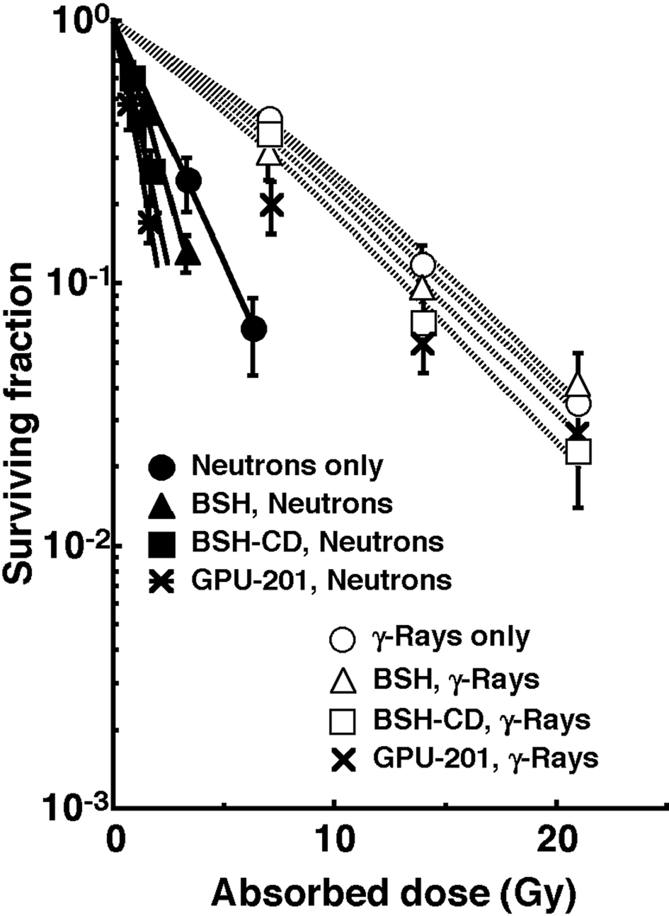 Methods: GPU-201 was synthesized from integrin-binding Arg-Gly-Asp (RGD) consensus sequence of matrix proteins and a 10B cluster 1, 2-dicarba-closo-dodecaborane-10B. Mercaptododecaborate-10B (BSH) dissolved in physiological saline and BSH and GPU-201 dissolved with cyclodextrin (CD) as a solubilizing and dispersing agent were intraperitoneally administered to SCC VII tumor-bearing mice. Then, the 10B concentrations in the tumors and normal tissues were measured by γ-ray spectrometry. Meanwhile, tumor-bearing mice were continuously given 5-bromo-2’-deoxyuridine (BrdU) to label all proliferating (P) cells in the tumors, then treated with GPU-201, BSH-CD, or BSH. Immediately after reactor neutron beam or γ-ray irradiation, during which intratumor 10B concentrations were kept at levels similar to each other, cells from some tumors were isolated and incubated with a cytokinesis blocker. The responses of the Q and total (= P + Q) cell populations were assessed based on the frequency of micronuclei using immunofluorescence staining for BrdU.