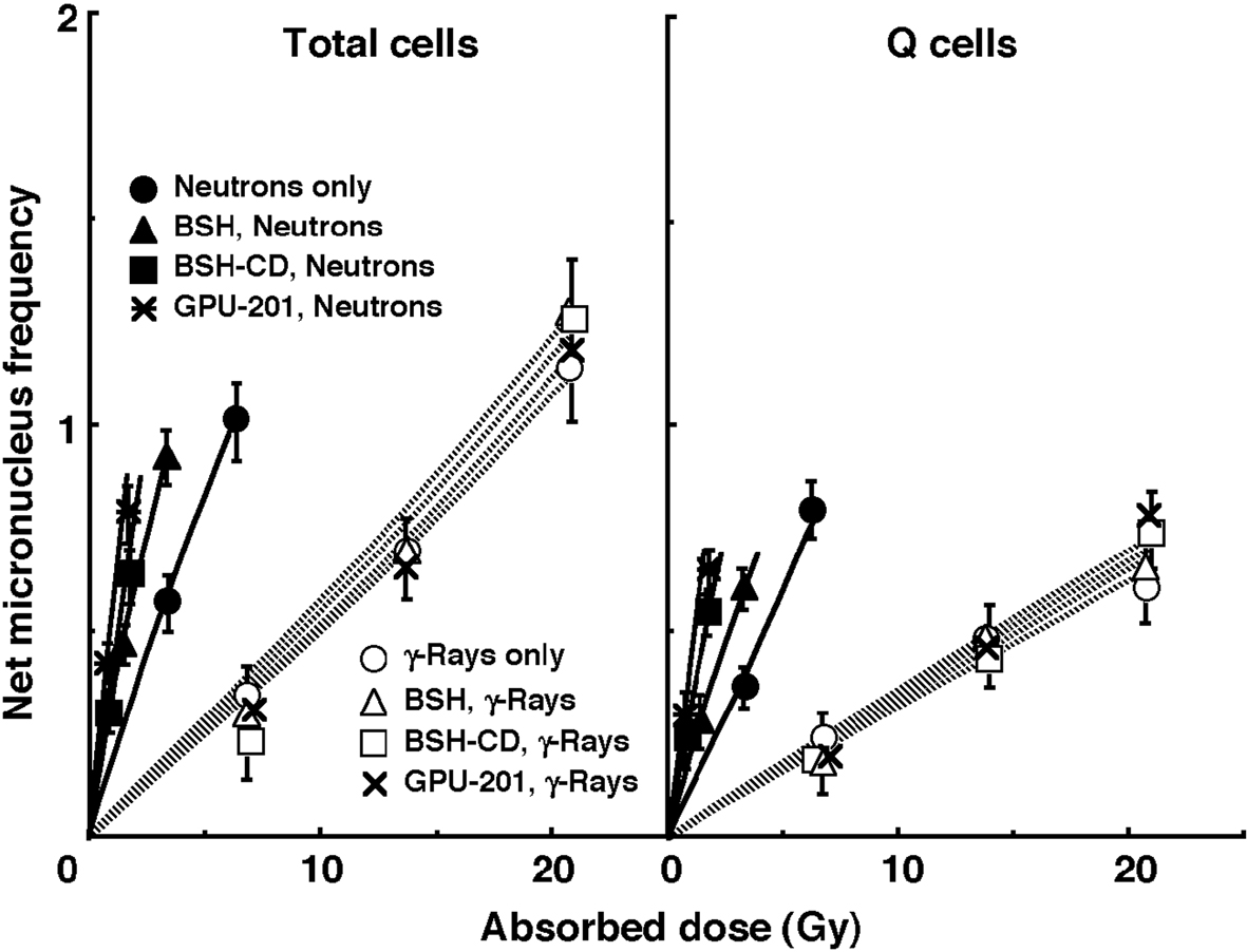 The left and right panels of Figure 4 show the net MN frequencies for irradiation in vivo as a function of the physically absorbed radiation dose in the total and Q tumor cell populations, respectively. When the 10B-carrier was employed, even if no radiation was given, MN frequencies were higher than when no 10B-carrier was administered, because of the slight genotoxicity of the drug (Table 1). Therefore, for background correction, we used the net MN frequency to exclude the effects of the genotoxicity of the 10B-carrier. The net frequency is the frequency in the irradiated tumors minus the frequency in the nonirradiated tumors. All net MN frequencies were actual values induced under each set of conditions. Namely, they included the values due to contaminating fast neutrons and γ-rays in the neutron beam.