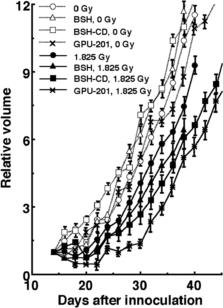 Figure 5 shows tumor growth curves after neutron beam irradiation with or without a 10B-carrier 14 days after the tumor cell inoculation. Tumor progression with an increase of 3 times the initial size at the time of irradiation can be clearly confirmed in the clinic. Therefore, to evaluate tumor growth, the period required for each tumor to become 3 times as large as it was on day 14 was obtained using the data shown in Figure 5 (Table 4). Without irradiation, with or without a 10B-carrier, there was no significant difference in the period. With irradiation at a physically absorbed dose of 1.825 Gy, the period required was significantly prolonged compared with no irradiation (P < 0.05), except for neutrons only without a 10B-carrier, and the treatments ranked in the following order; without a 10B-carrier < with BSH < with BSH-CD < GPU-201.