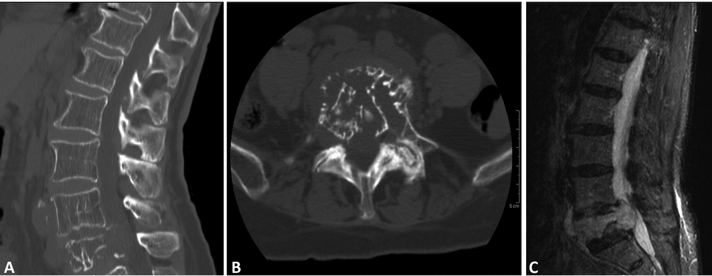 Computed tomography (CT) of the lumbar spine demonstrated a compression fracture at L5 with a soft tissue density mass causing significant canal stenosis at that level (Fig. 1A, B). An MRI scan obtained demonstrated an osteolytic lesion, compression fracture of L5, and a soft tissue mass with 1 cm retropulsion causing significant canal stenosis (Fig. 1C). AP and lateral radiographs of the T-spine showed degenerative lumbar scoliosis, and grade I L4 on L5 anterolisthesis. CT of the chest, abdomen and pelvis did not reveal evidence of neoplasm except the L5 lesion.