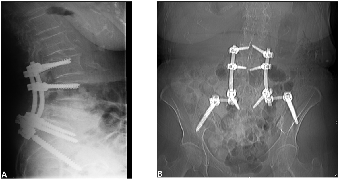 She underwent L4-L5 laminectomy and right transpedicular approach for decompression of the burst fracture. Upon exposure of the burst fracture a soft tissue mass was palpated ventral to the thecal sac. The canal was decompressed and the sac was released of any pressure. L3 to iliac posterior spinal fusion with instrumentation was carried out with placement of bilateral pedicle screws (Fig. 2A, B). Graft arthrodesis was done using 10 mL Grafton DBM Crunch (Osteotech Inc., Eatontown, New Jersey) and 30 mL cancellous bone. Due to the oncologic nature of the procedure neither local bone nor BMP was utilized. The patient was monitored during the procedure with somatosensory evoked potentials (SSEP) without any significant changes.