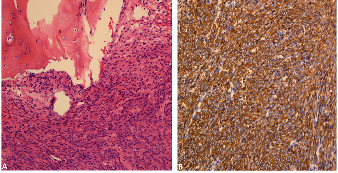 ![]() Click for large image | Figure 3. (A) Bone involved by cellular spindle cell proliferation forming fascicles with mild nuclear atypia and rare mitoses. (B). Tumor cells are diffusely positive for smooth muscle actin. |