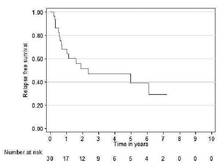 ![]() Click for large image | Figure 2. Relapse free survival curve for curative patients. |