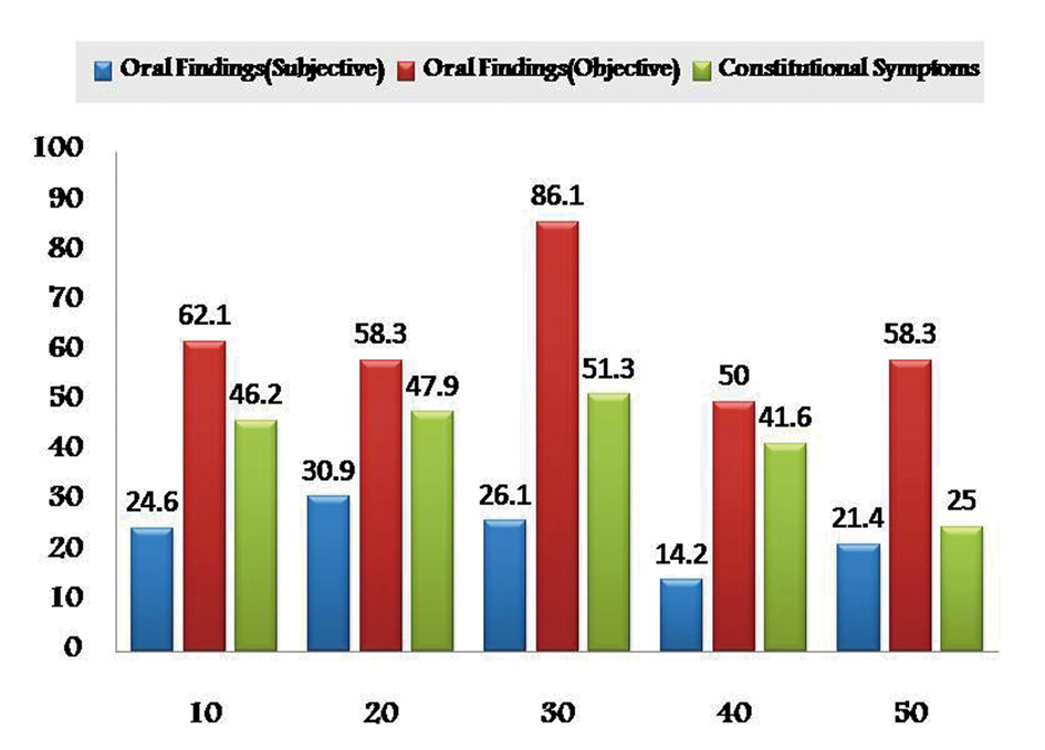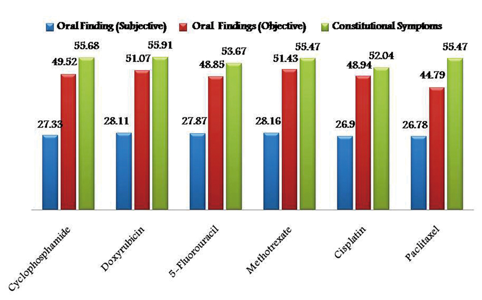 As the chemotherapeutic drugs administrated were common to both the groups, results were tabulated together. Prevalence of subjective and objective oral findings in both the groups was found to be highest with methotrexate (28.16% and 51.43%) and lowest with Paclitaxel drug (26.78% and 44.79%) respectively. Whereas constitutional symptoms was found to be highest with doxyrubicin (55.91%) and minimum with cisplatin (52.04%) (Fig. 1). Whereas some cases of group I are treated with radiotherapy alone after surgical resection in such cases prevalence of subjective and objective oral symptoms increased from 10th - 30th fractionated dose of radiations and then subsequently decreased and found to be lowest at 50th fractionated dosage. Constitutional symptoms were found to be consistent in all fractionated dosages with lowest at 50th fraction (Fig. 2).