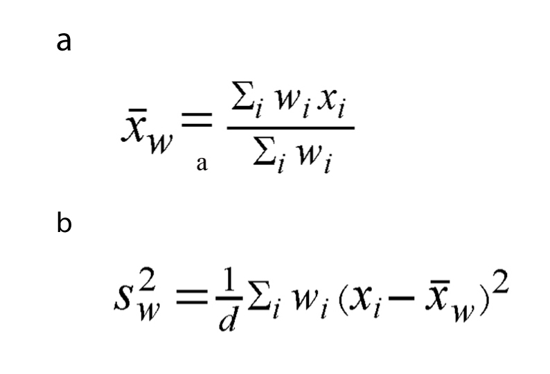 ![]() Click for large image | Figure 1. The weighted mean (a) and the weighted variance (b), wi is the weight for the ith study, xi is the ith variable value, and the variance divisor d is n-1. |