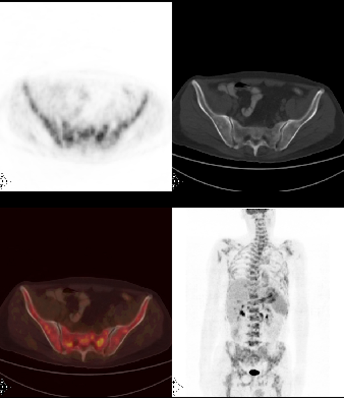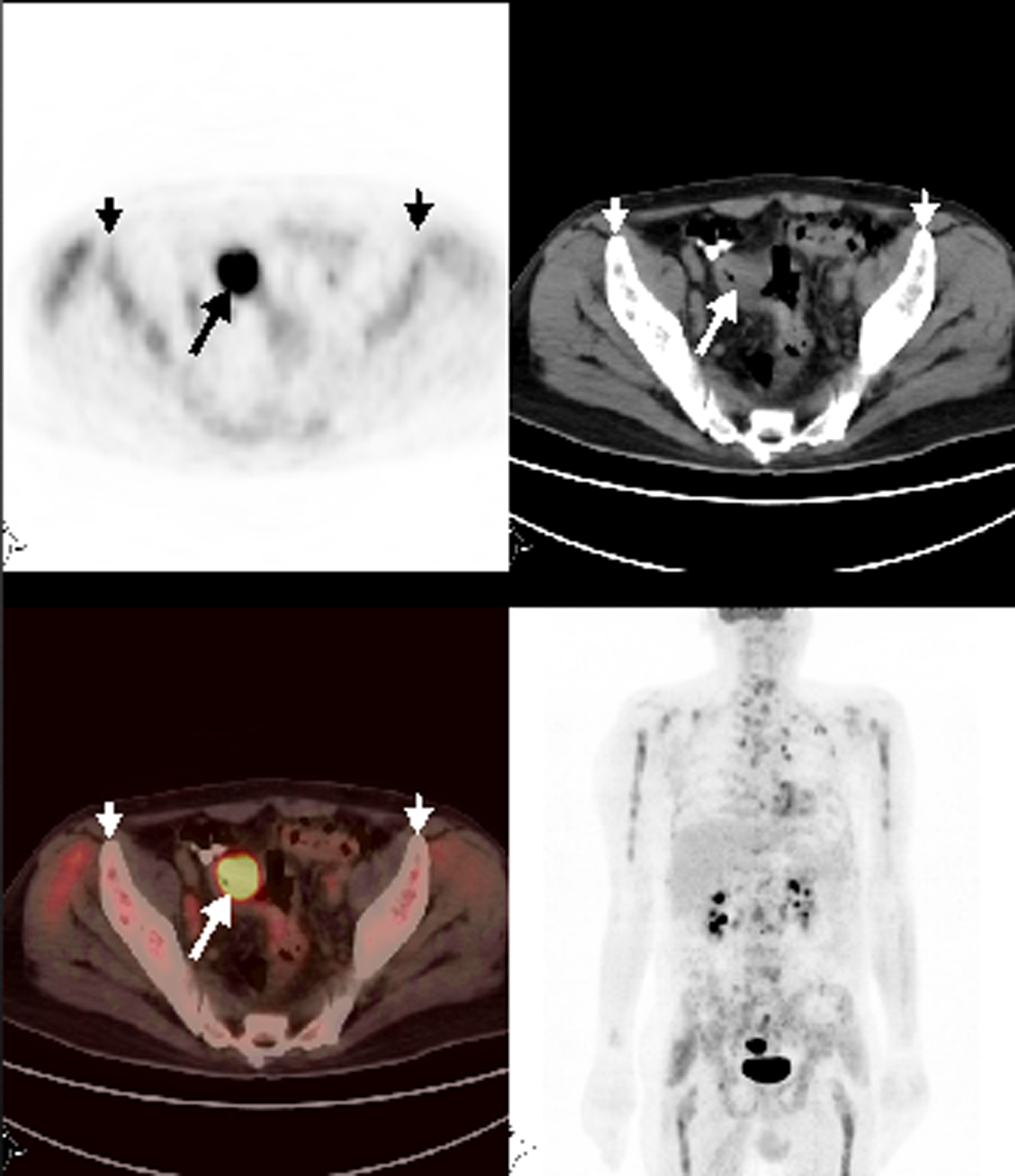 A 56-year-old male patient who was on follow-up for rectosigmoid colon cancer revelaed a pelvic mass on abdominal CT. FDG-PET/CT performed for staging showed hypermetabolic mass consistent with recurrence and metastatic lymphadenopaties at the left inguinal, right external iliac and promontorial region. PET/CT also revealed metastatic lesion in the liver and multipl lesions at the bones as well as in the bone marrow (Fig. 3). Bone marrow biopsy was done with absolutely normal blood count directed by PET/CT findings. Bone marrow metastasis was found consistent with poorly differentiated mucinous adenocarcinoma secondary to colon cancer.