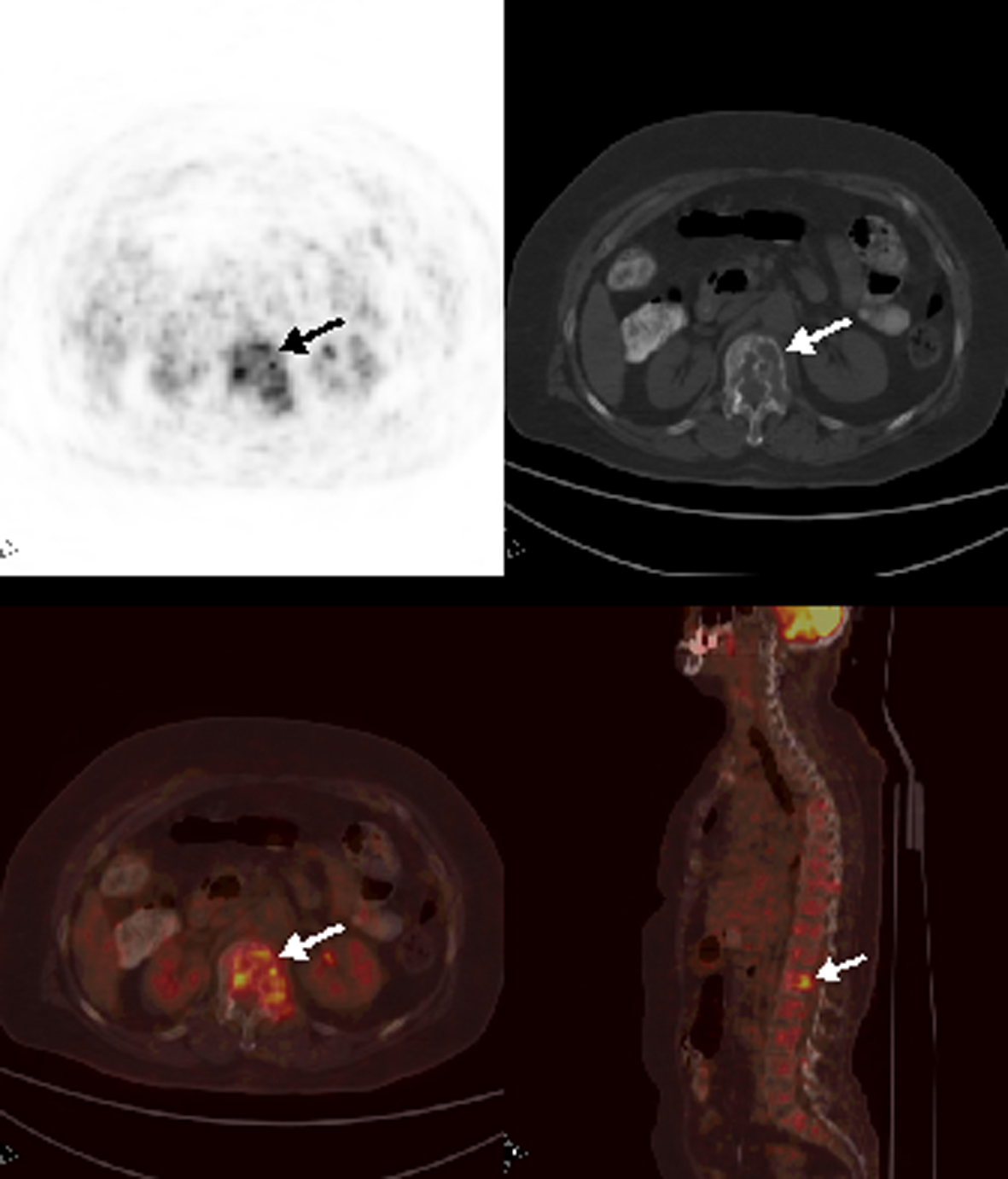 ![]() Click for large image | Figure 4. Axial and sagittal PET/CT images depicted multiple heterogeneously increased FDG uptake at vertebral column. |