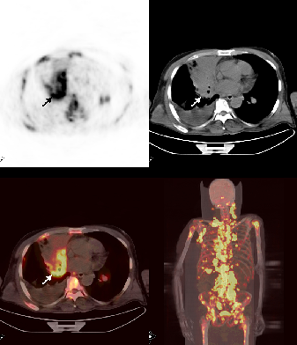 ![]() Click for large image | Figure 5. Axial and MIP PET/CT images showed a mass at the right hilar region with very intense FDG accumulation. There were also multipl bone-bone marrow metastases and extraskeletal metastases with prominent FDG uptake. |