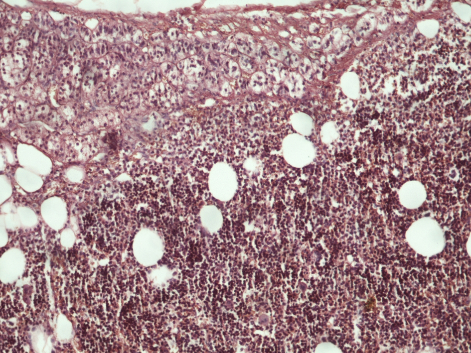Myelolipomas are well circumscribed in gross inspection, but are rarely encapsulated. Their color varies from pale yellow to deep red or brown depending upon the relative proportion of fat and hematopoietic elements. The contour of the adrenal myelolipoma is smooth, wavy, or irregular and may shoe intermingling of cortical cells with elements of the myelolipoma. The surrounding cortical cells can be relatively normal in appearance or compressed (Fig. 1). There is a variable mixture of mature fat with hematopoietic elements, often with full representation of the major cell lines (Fig. 2). Rarely foci of ossification are seen.