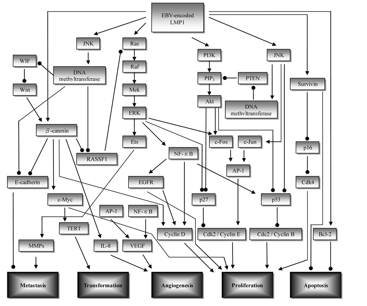 The principal EBV oncoprotein, LMP1, has been suggested to contribute to the highly invasive nature of NPC. Signal transducer and activator of transcription 3 (STAT3) is a master transcriptional regulator in proliferation and apoptosis and is newly implicated in angiogenesis and invasiveness, which, in turn, are likely to contribute to the highly invasive character of NPC. Wang et al showed that LMP1 signals the Janus kinase 3 (JAK3) and extracellular signal-regulated kinase 1/2 (ERK1/2) pathways upon the activation of STAT3 as well as STAT transactivation activity. LMP1 induces VEGF expression via the JAK/STAT and mitogen-activated protein kinase (MAPK)/ERK signaling pathways. LMP1 can directly activate Ras, thus initiating the signaling cascade resulting in ERK activation [119]. Wang and colleagues reported that there was a statistically significant association between positive p-ERK expression and advanced clinical stage. Positive p-ERK expression was correlated with poorer OS, DFS and time to progression (TTP) [120].