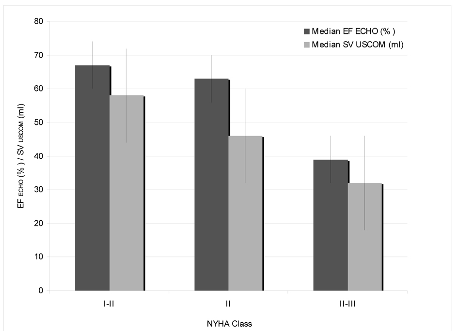 ![]() Click for large image | Figure 1. Clinical presentation by NYHA classand correlation to median EF by echocardiography and SV by USCOM. |
